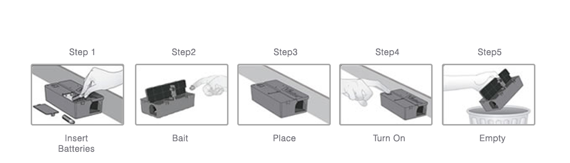The Victor® Electronic Mouse Trap is easy to use. Simply insert batteries, bait, place, turn the trap on and empty! Open the battery compartment and insert 4 “AA” batteries. To bait, open the lid on top of the trap and place a small amount of peanut butter, chocolate, hazelnut spread or any of their favorite foods along the back wall of the trap in the bait trough provided. Place the trap where you have seen signs of rodent activity or along the wall where rodents primarily travel. The trap should be placed lengthwise against the wall with the entrance hole nearest the wall. Turn on the trap. A green light will blink once showing the trap is working properly.